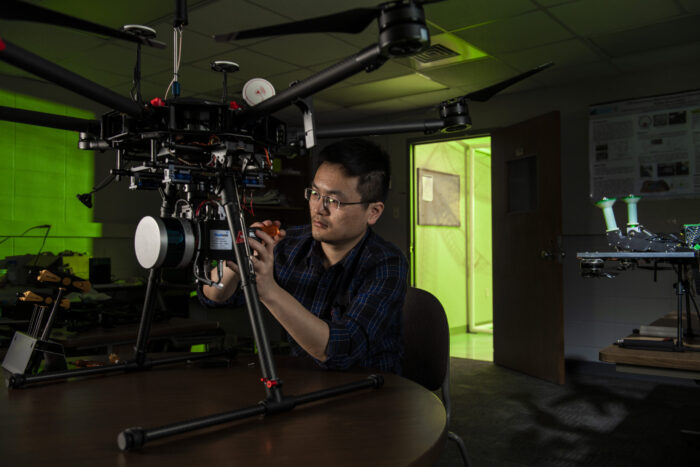 Dr. Xinzhe Yuan, a Missouri S&T alumnus, adjusts a drone in an S&T lab when he was a student in 2021. Photo by Michael Pierce/Missouri S&T.