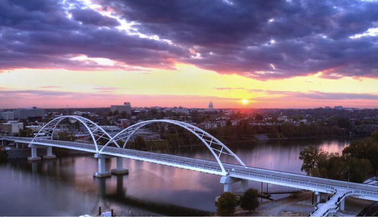 The Veterans Memorial Bridge connecting Little Rock and North Little Rock, Ark., features two 440-foot “basket handle” network tied-arch spans. Its opening in March 2017 (28 days ahead of schedule) was one of several examples in the modernization of tied-arch bridges, where the Arkansas Department of Transportation and HNTB successfully implemented several innovative engineering solutions to address redundancy.