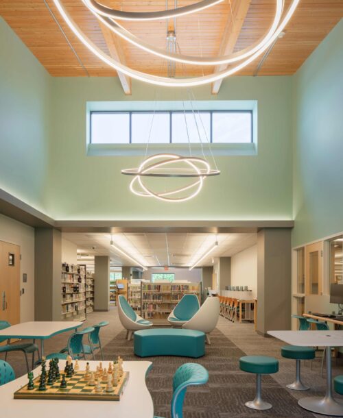 DIG also transformed the former space with new lighting, finishes and tailored spaces such as a fireside reading area as well as new meeting rooms and a community room with a kitchenette. The addition of a maker space and recording studio also enhances the library’s offerings.