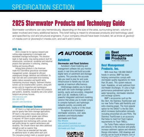 Stormwater conditions can vary tremendously, depending on the size of the area, surrounding terrain, volume of water involved and many additional factors. This brief listing is meant to showcase products and technology used and specified by civil and structural engineers. If your company should have been included, let us know at gsolo@v1-media.com or jboone@v1-media.com, and we’ll add it online.