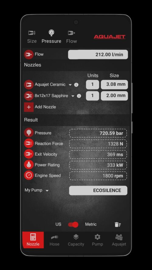 The Aquajet Calculator 3.0 app allows users to calculate various values, such as pressure, flow, nozzle size, hose pressure drop, removal capacity, pump configuration and more.