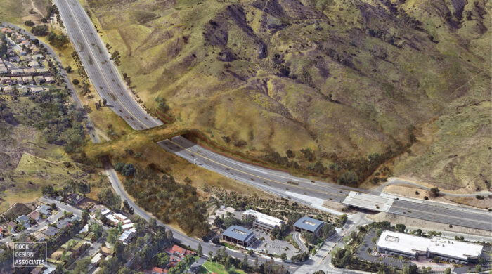 The Wallis Annenberg Wildlife Crossing will span U.S. Highway 101 to connect the Santa Monica Mountains along the Pacific Ocean with the Sierra Madre Range to the north. (Rock Design Associates and National Wildlife Federation)