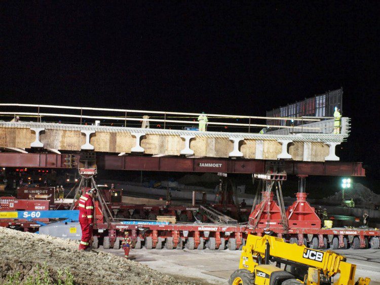 The SPTMs took time to set up in the staging areas and fine-tune the final placement. Transport of the bridge superstructure in two sections took place at a walking pace and was the least time-consuming element of the 12-hour process.