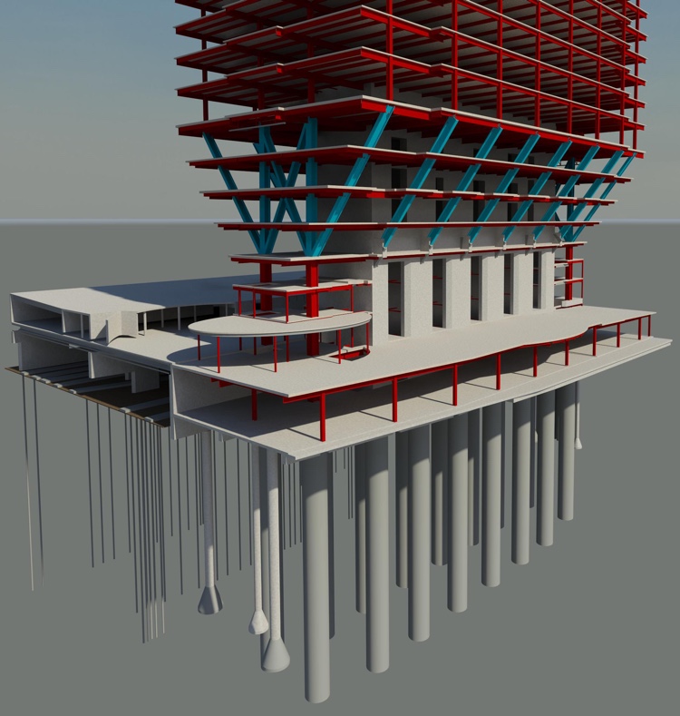This Autodesk Revit Structure model details the 16 10-foot-diameter caissons (inset) that extend 100-feet deep and are socketed five feet into the bedrock below.