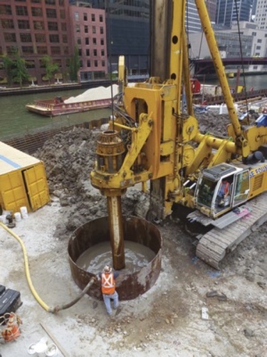 The mat itself caps 16 caissons, each a 10-foot-diameter steel tube filled with concrete extending 110-feet deep and socketed five feet into bedrock below. These are the largest caissons in Chicago, carrying gravity loads of 28 million pounds. The caissons also resist the lateral loads applied by the Windy City by vertically cantilevering above the Chicago River. When these overturning effects of wind are included, the caisson load jumps to 45 million pounds, pushing right up against the load capacity limits of the bedrock below.