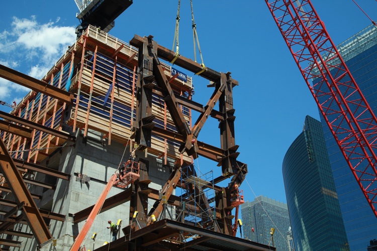 Along with the typical design and construction challenges associated with erecting an office building, limitations on the building footprint meant the steel structural system supporting the upper floors would require special attention, from design to fabrication to erection. The tremendous gravity loads from the 54th through 8th floors would be transferred to the building’s core via a massive steel-truss system. The 16 wide-flange sections transferring this load each delivered 8 million pounds of force to the core. To meet the challenge, engineers would specify some of the largest steel sections in the world.