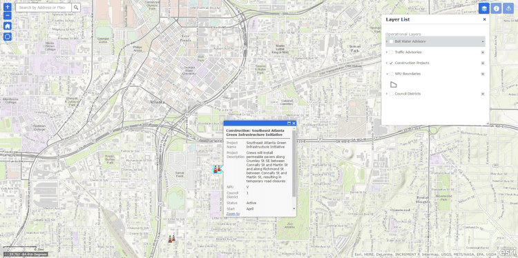 A real-time web map goes a long way to prevent sickness when force majeure strikes. Last winter, a torrential storm caused two water pump outages in Atlanta, Georgia, risking contamination and necessitating a boil water advisory be issued to affected residents. To widen its outreach, the Atlanta Department of Watershed Management (DWM) used social media and the local news to promote a mapping Web site that showed the areas affected by the outages.
