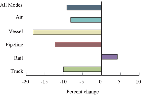 Lower crude oil prices contributed to a year-over-year decrease in the value of freight moved between the U.S. and Canada. Crude oil is a large share of freight carried by pipeline and vessel, which were down 28.0 percent and 37.1 percent respectively year-over-year (Figure 3, Table 3).