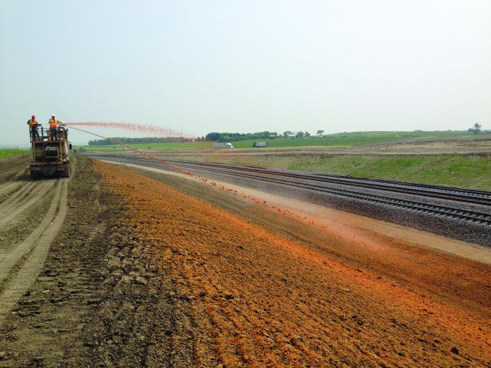 Sherbrooke knew that the BFM would deliver better erosion control, provide enhanced growth performance, and save substantial time and money. BNSF agreed to the material change with one caveat: Any BFM used on the project had to meet BNSF’s signature orange color; a tough task for any manufacturing company. Profile immediately got to work on testing different colors that would be suitable for the task at hand.