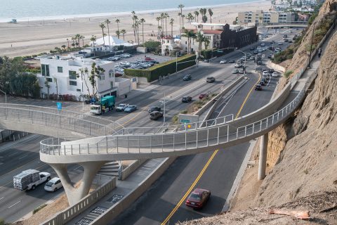 Design challenges overcome by TYLI included working with an existing trail with a steep 10% grade; space limitations over the California Incline roadway; the bridge location between steep, erodible cliffs and the City of Santa Monica (City) property line; and a large elevation drop between the popular trail and the roadway. Although the design for the overcrossing was driven by such constraints, TYLI designed the sculptural profile to resemble a nautilus shell, facilitating its connection to the marine environment.