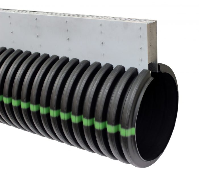 Duraslot® linear surface drains are made by incorporating a heavy-duty aluminum inlet slot mounted on top of ADS N-12® corrugated HDPE pipe. The slotted inlet at grade intercepts sheet flow across a paved area or is installed against a curb or barrier in a gutter-type application. These high-capacity drains are designed to remove storm water as it flows across paved or cleared areas, or as it collects in low spots.
