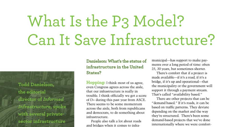 Todd Danielson, the editorial director of Informed Infrastructure, spoke with several private-sector infrastructure executives to learn more about the public-private partnership (P3/PPP) model, how it works and if it can be part of the solution to the massive infrastructure problem in the United States and beyond.