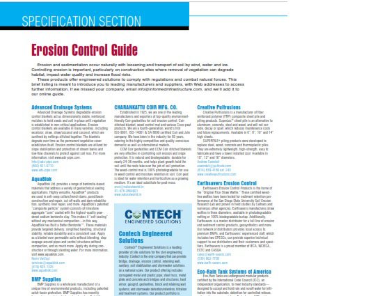 These products offer engineered solutions to comply with regulations and combat natural forces. This brief listing is meant to introduce you to leading manufacturers and suppliers, with Web addresses to access further information. If we missed your company, email info@informedinfrastructure.com, and we’ll add it to our online guide.