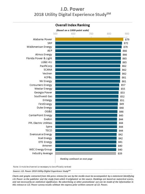 - Standouts are emerging: Though overall utility industry performance is weak, there is a wide range of performance, with some providers achieving digital customer satisfaction scores that are in line with top performers in other industries. The highest-ranked utility in the study, Alabama Power, has a J.D. Power customer satisfaction score of 879, which is a significant 40 points higher than industry average.