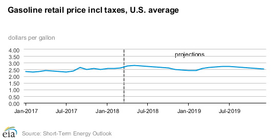 - For the 2018 April–September summer driving season, EIA forecasts U.S. regular gasoline retail prices to average $2.74/gallon (gal), up from an average of $2.41/gal last summer (see Summer Fuels Outlook). The higher forecast gasoline prices are primarily the result of higher forecast crude oil prices. For all of 2018, EIA expects U.S. regular gasoline retail prices to average $2.64/gal and gasoline retail prices for all grades to average $2.76/gal, which would result in the average U.S. household spending about $190 (9%) more on motor fuel in 2018 compared with 2017.