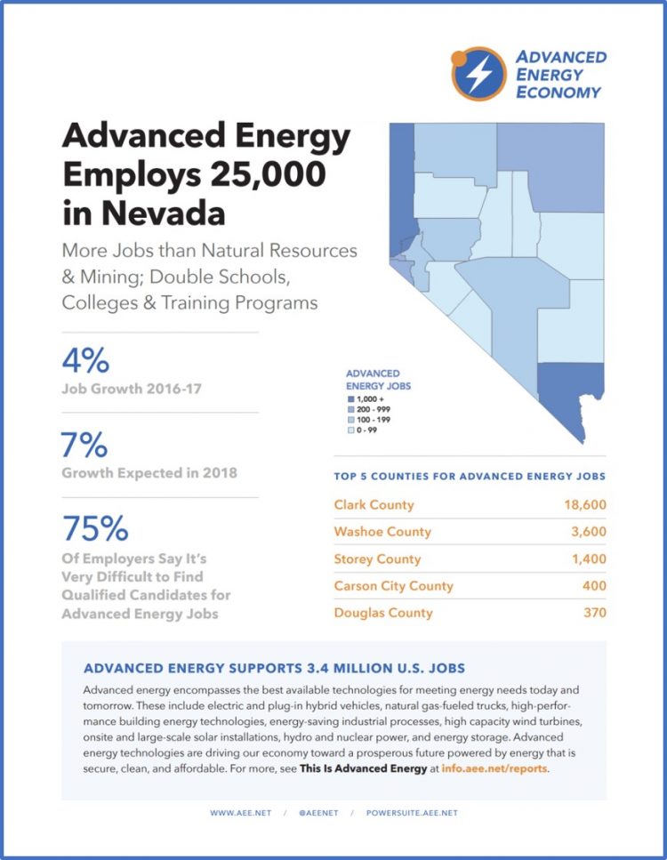 • Advanced energy jobs grew 4% from 2016-2017 in Nevada – faster than overall jobs growth in the state. Advanced energy employers expected to increase these jobs by 7% in 2018.