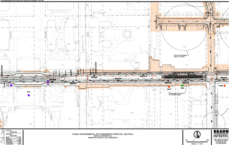 Braun Intertec was hired by the Metropolitan Council to perform several critical support services during the project, including a Phase II ESA of nearly 500 locations. Nearly 1,000 soil and groundwater samples were collected and analyzed in the Braun Intertec lab during a six-month period for more than 350 chemicals. In the end, more than 65,000 unique data sheets were compiled. Two field teams of four people each completed the work. As the Phase II ESA was on an aggressive schedule, the most-important stakeholders wanted to receive field observations and boring results daily.