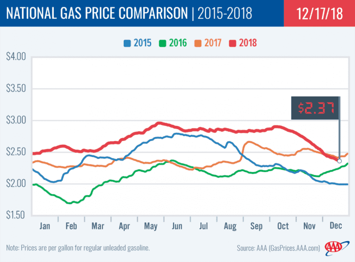DENVER – At $2.39, Colorado’s gas price average continues to drive toward the cheapest pump prices seen during the month of December since 2016 – welcome news to the 1.77 million Coloradans expected to road-trip to their holiday destination. Nationally, prices continued their decline to a 2018 low of $2.37 per gallon of regular unleaded.