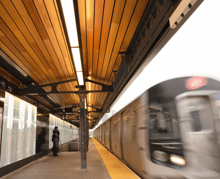 “We wanted to provide commuters with a highly functional solution that would also improve the appearance of elevated subway and train platforms,” says Jon Mestad, brand manager, ASI Architectural. “The solution offers a beautiful and sophisticated design yet was built tough to endure the environmental conditions of both exterior and interior transit stations and can easily be installed into existing mid-twentieth century iron-and-steel platform structures using a simple grid structure along the station and platform ceilings. The refined look created by the longitudinal wood-plank ceiling surfaces are especially pleasing to commuters.”