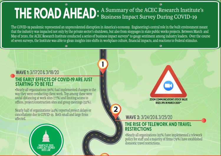 “The pandemic was an unforeseen and unique challenge for our industry,” said Charles Gozdziewski, ACEC’s Board Chair. “Firm executives were forced into uncharted waters, adapting to forced changes to workplace operations, commuting, project work and financial planning. The Business Impact Surveys gave our members a roadmap to check their own planning against industry trends on a weekly basis. Its value underscored the importance of the Institute’s mission.”