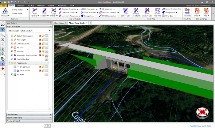 GeoHECRAS is an AutoCAD, Bentley MicroStation and ESRI ArcGIS compatible interactive 2D/3D graphical user interface data wrapper to U.S. Army Corps of Engineer’s HEC-RAS software. GeoHECRAS greatly speeds up HEC-RAS model creation and produces modeling scenarios that are more accurate and ultimately more useful to engineers.