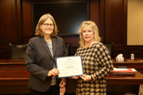 MDOT Executive Director Melinda McGrath (left) presents Environmental Division Director Kim Thurman (right) with the AASHTO 25-Year Award of Meritorious Service at a recent Mississippi Transportation Commission meeting in Jackson.
