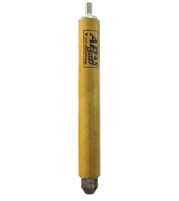 The AP4.5 Ultra AutoPump System features a fiberglass pump body, stainless steel pump ends, internal components, and fittings for tubes and hoses. This standard model is 4.5 inches in diameter, is 39.3 inches long, weighs 17.8 pounds, and can reach a maximum flow of 13 gpm.
