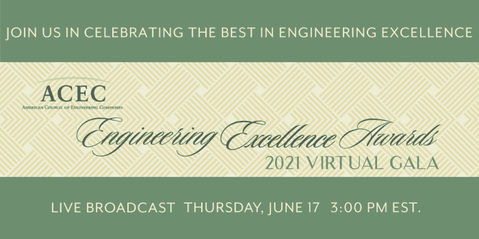 Washington, DC – The American Council of Engineering Companies is pleased to announce that the 54th annual Engineering Excellence Awards Gala will be broadcast over the internet at 3:00 PM Eastern on June 17th.  Registration is now open for this signature event.