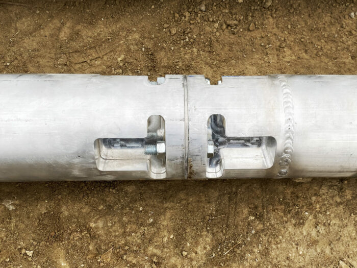 The operator simply places the centering ring between two pipes, securely seating them together. From there, the cut outs at the pipes’ ends allow the operator to easily insert three bolts, securing the pipes together by tightening the nuts. With this setup, users don’t have to retighten their pipes mid-job or worry about unthreading when changing screeding directions.