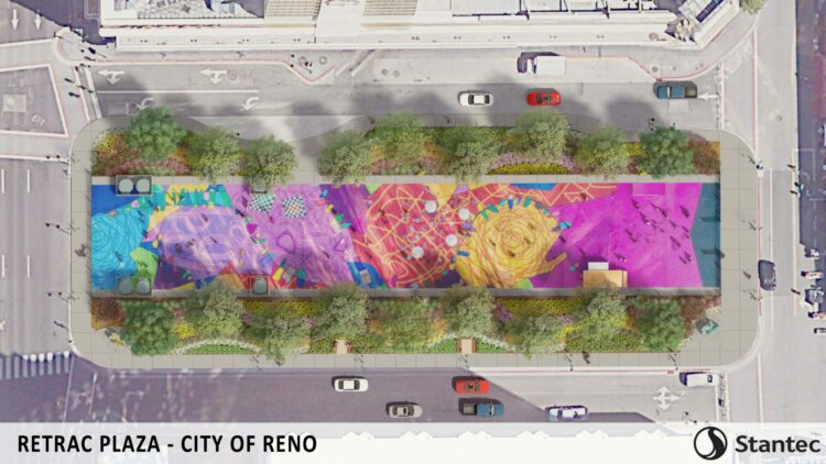 Reno, NV – The City of Reno, Nevada, was recently selected as one of 16 city projects in the first year of the Bloomberg Philanthropies Asphalt Art Initiative. The selection, coupled with an additional Nevada Main Street grant, enables a critical city beautification project more than a decade in the making to move forward. In collaboration with the Downtown Reno Partnership and the City of Reno, global design firm Stantec led the conceptual plan for the beautification of the Reno Transportation Rail Access Corridor (ReTRAC). The ReTRAC beautification project will feature a large community-themed mural as its centerpiece, complemented by a large variety of perennials and grasses to emulate the motion of the mural with different seasonal colors and textures. The project is part of a larger placemaking and programming goal for the Downtown Reno Partnership and is set to serve as an aesthetically pleasing backdrop for large community events and activities.