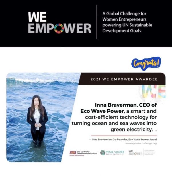 Inna Braverman, Founder and CEO of Eco Wave Power, Awarded the SDG Excellence Award by WE EMPOWER- A Global Challenge for Women Entrepreneurs Powering UN Sustainable Development Goals