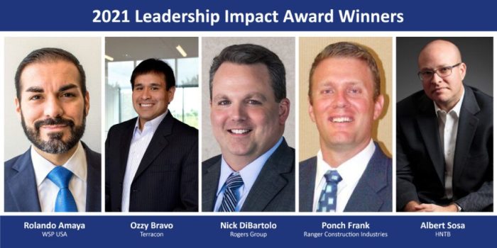 The winners of the 2021 Leadership Impact Awards, announced during the association’s national convention in Pinehurst, N.C., were evaluated on these key criteria: 1) demonstrated contributions to national, state, or local transportation design and construction associations or professional societies in at least one of three areas: infrastructure funding or regulatory advocacy, safety, innovation, technology or communications/marketing; 2) proven track record displaying visionary thinking, driving change, or solving problems that helped improve operational performance; and 3) measurable examples serving as a mentor to firm/agency colleagues or industry peers, and/or driving efforts to promote diversity and inclusion.