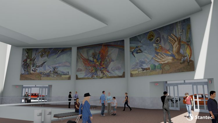 To move the mural pieces—each 16-by-25 feet—the wall behind them at Terminal 2 was removed, a steel support structure was used, the panels were lowered onto a flatbed trailer, and the panels were moved at night to protect them from weather extremes. The panels were stored in an airport hangar until their new location at the Rental Car Center was ready. Stantec designed a new wall specifically for the artwork at the Rental Car Center, including special lighting to highlight the beauty of the mural.