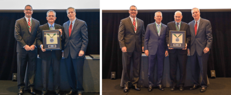 First photo: Richard Haws (center) is with Leon Topalian (left) and AISI President and CEO Kevin Dempsey on the right. Second photo: David Stoddard (third from left) is with Leon Topalian (far left); Charles Schmitt, president of SSAB Americas (second from left); and Kevin Dempsey, president and CEO of AISI (right).