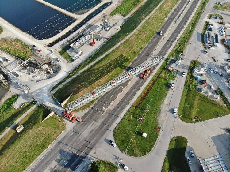 Six pipe rack modules needed to be set across various existing infrastructure including four lanes of Illinois Highway 3, the Mississippi River levee, and five railroad tracks owned by various operators all in the Hartford, Illinois region. The customer wished to assemble all modules at lower elevations and requested that Mammoet jack the modules up to the required elevation before transport and setting.