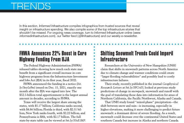 The Federal Highway Administration (FHWA) released tables showing how much each state may benefit from a significant overall increase in core highway programs from the Infrastructure Investment and Jobs Act (IIJA) in its first year, fiscal 2022.