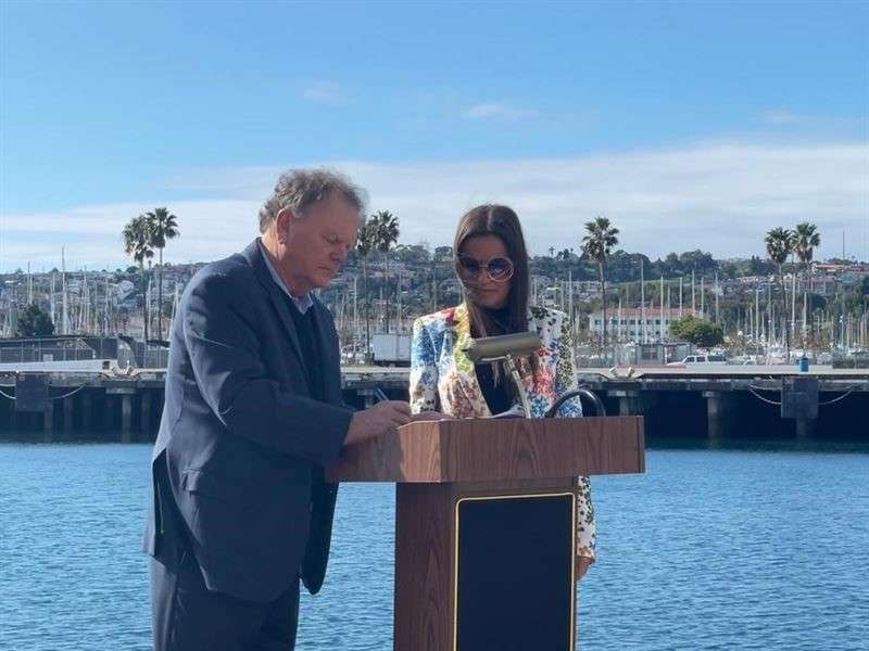 Terry Tamminen, CEO of AltaSea and Inna Braverman Founder and CEO of Eco Wave Power, during the Signing Ceremony of the Collaboration Agreement, in the Port of Los Angeles (Photo)