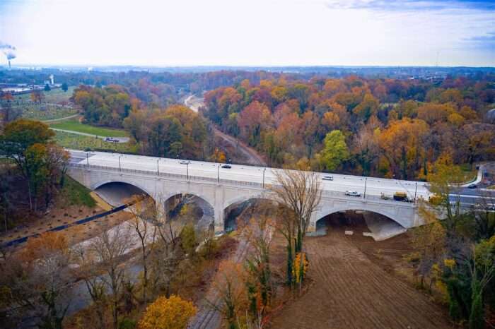 Stantec provided comprehensive inspection engineering services, a load rating and coatings evaluation, and studies for rehabilitation versus replacement for a deteriorating bridge in Baltimore that was originally built in 1907. After the decision was made to replace the bridge, it was important to consider the urban setting of Edmondson Avenue as well as the bridge’s historic value. Other challenges included adjacent historic row houses, a trail/bike path, Gwynns Falls, a railway, and a cemetery. As such, the design team gained consensus with various stakeholders and the public by providing timely and informative coordination—which was critical to the project’s success. The reconstructed bridge, designed by Stantec, incorporates architectural arch facades to recognize the historic nature of the original structure and provides a safe and secure structure for commuters and pedestrians on Route 40.