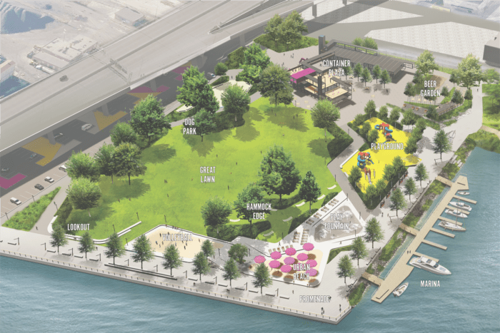 Phase I will include the construction of a multi-level riverfront promenade with terraced seating, a floating dock and marina with an accessible kayak launch, a fishing pier, and shoreline restoration and habitat enhancements. Construction of the second phase is tentatively planned to start in 2023 and will include a great lawn for concerts, festivals, and other events; a dog park; urban beach; adventure playground; and splash pad. The third and final phase will include a unique commercial plaza that will support local start-up businesses that specialize in food, beverage, retail, and recreation.