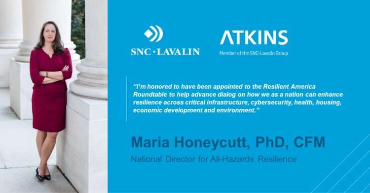 CALVERTON, Md., USA: Atkins, a member of the SNC-Lavalin Group, is pleased to announce its National Director for All-Hazards Resilience, Maria Honeycutt, PhD, CFM has been appointed to the National Academies of Sciences, Engineering, and Medicine’s (NASEM’s) Resilient America Roundtable. Dr. Honeycutt is a nationally recognized subject matter expert and trusted executive advisor on climate and weather hazards, floodplain management and multi-hazard risk reduction.