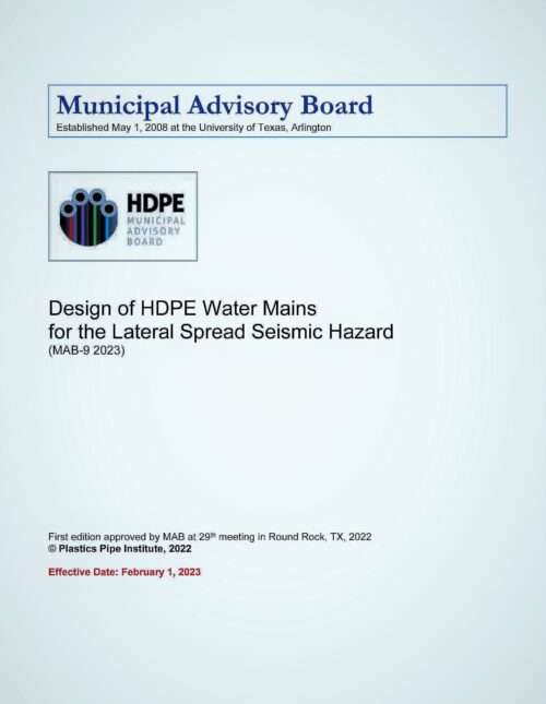 IRVING, TX – The Municipal Advisory Board (MAB) of the Plastics Pipe Institute, Inc. (PPI) today announced the publication of a new technical document that provides data for high-density polyethylene (HDPE) water lines in earthquake sensitive areas. MAB-9, Design of HDPE Water Mains for the Lateral Spread Seismic Hazard is available for free on the group’s website.