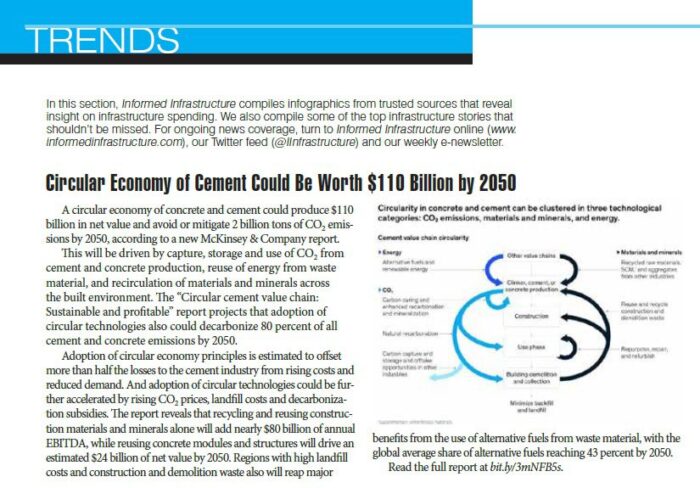 A circular economy of concrete and cement could produce $110 billion in net value and avoid or mitigate 2 billion tons of CO2 emissions by 2050, according to a new McKinsey & Company report.