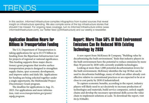 In this section, Informed Infrastructure compiles infographics from trusted sources that reveal insight on infrastructure spending. We also compile some of the top infrastructure stories that shouldn’t be missed. For ongoing news coverage, turn to Informed Infrastructure online (www.informedinfrastructure.com), our Twitter feed (@IInfrastructure) and our weekly e-newsletter.