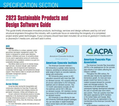 This guide briefly showcases innovative products, technology, services and design software used by civil and structural engineers throughout the industry, with a particular focus on extending the longevity of a completed project and/or green technologies. If your company should have been included, let us know at gsolo@v1-media.com or jboone@v١-media.com, and we’ll add it online.