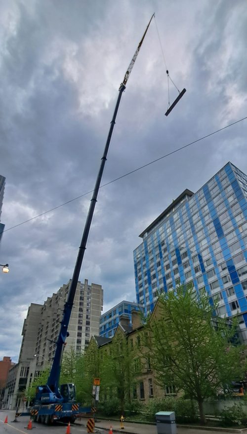 One of the main points addressed during the execution of the project was the proximity to the Toronto Children’s Hospital, especially the access to the emergency parking lot, which was partially blocked by the working position of the crane. Because of this, permission had to be sought from the hospital’s administration board to carry out the installation. Thus, strict traffic control had to be carried out to allow the vehicles that had to go to the hospital to get through.