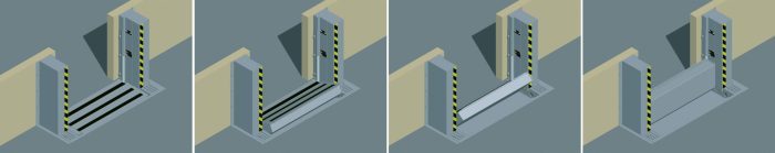 When not deployed, the Pop-Up Barrier stores flat on the floor, so there is no need for berms or ramps. When a liquid flow reaches the barrier, it is collected in the sump that houses the barrier wall. As the volume of liquid increases, it displaces the wall from its horizontal position. The built-in mechanism then brings the barrier to its full locked and upright position, containing or holding back the impending liquid. This lightning-fast response to a spill or flooding event can save time and money on cleanup operations. After the event, Pop-Up Barriers can be easily reset and reused.