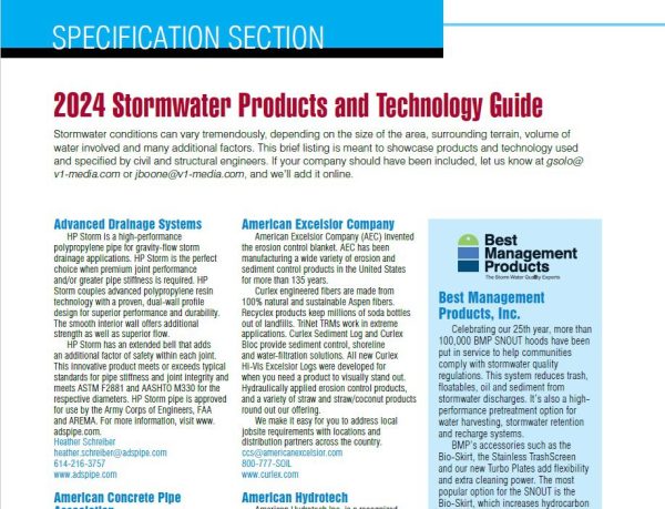 Stormwater conditions can vary tremendously, depending on the size of the area, surrounding terrain, volume of water involved and many additional factors. This brief listing is meant to showcase products and technology used and specified by civil and structural engineers. If your company should have been included, let us know at gsolo@v1-media.com or jboone@v1-media.com, and we’ll add it online.
