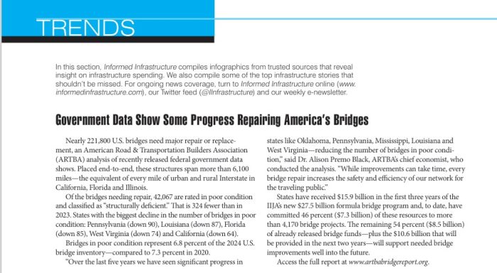 “Over the last five years we have seen significant progress in states like Oklahoma, Pennsylvania, Mississippi, Louisiana and West Virginia—reducing the number of bridges in poor condition,” said Dr. Alison Premo Black, ARTBA’s chief economist, who conducted the analysis. “While improvements can take time, every bridge repair increases the safety and efficiency of our network for the traveling public.”