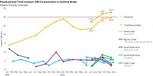 Grapher users can now more clearly demonstrate multifaceted data insights with enhanced visualization functionality, as in this review of uranium concentrations in surface water sources in Adams County, Colorado.