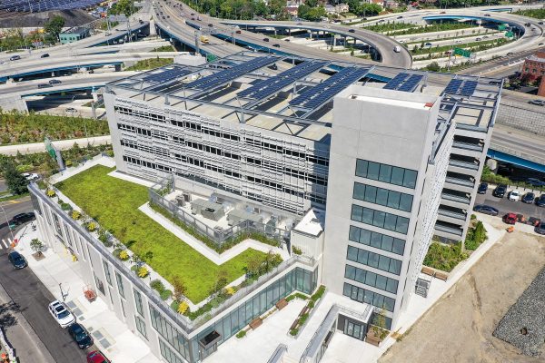 The complex consists of two structures, which are adjacent to each other. One is the six-story parking garage and the other is a two-story community space, which will be leased to a community organization in the future. The building is all electric and uses no gas or other fossil fuels of any kind. The site also features a new publicly accessible plaza with a grand staircase that faces the nearby Queens Borough Hall and Municipal Complex, which is located across 126th Street from the community space.
